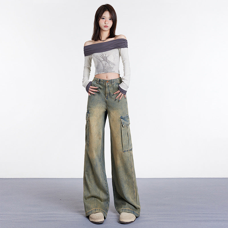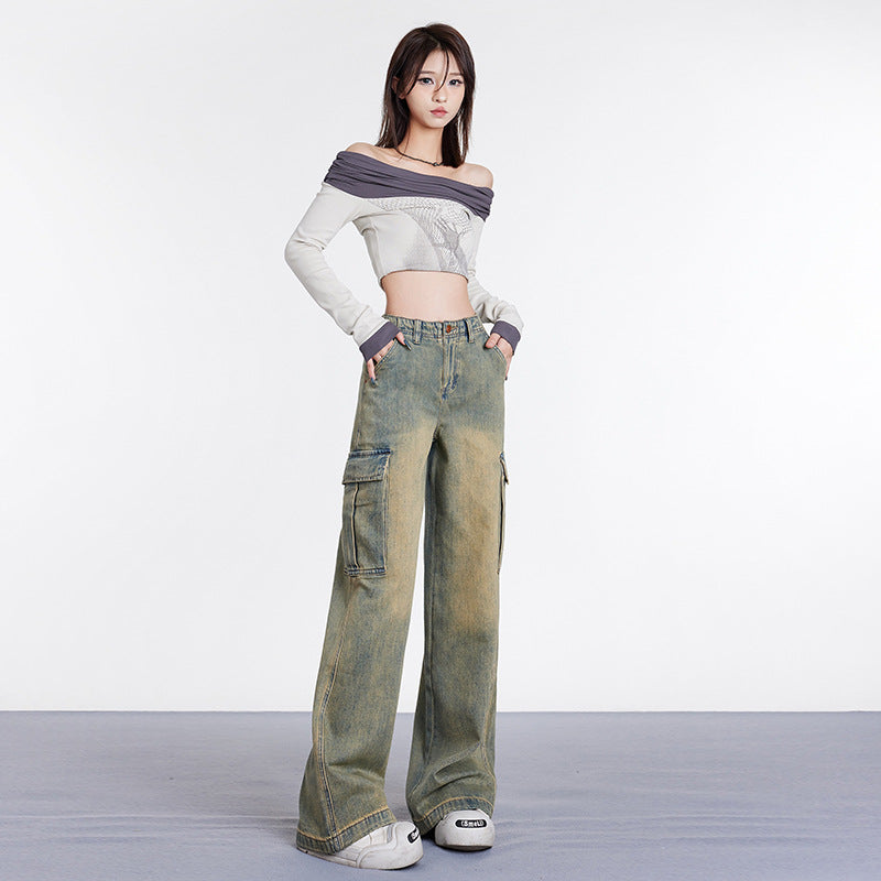 [¥0] Street Tiny High Waist Wide Leg Straight Denim