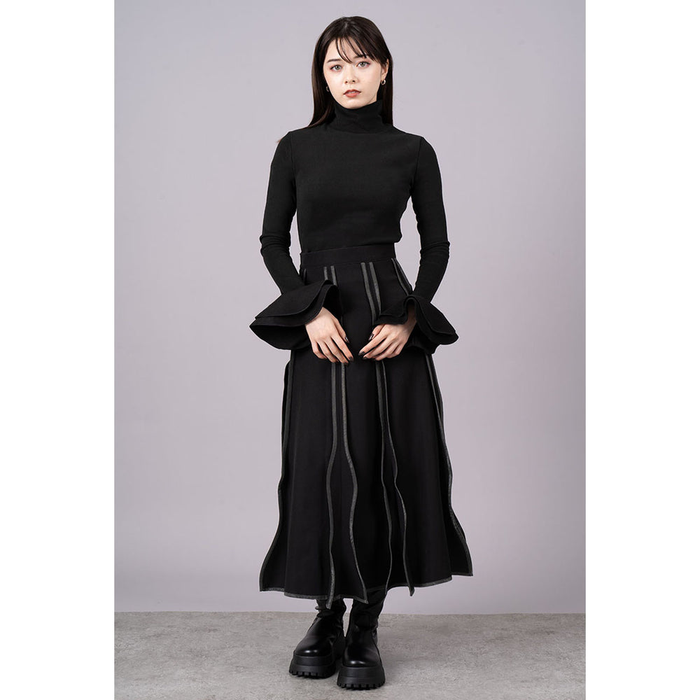 波のようなパイピングデザインが目を惹くミモレ丈のスカート。