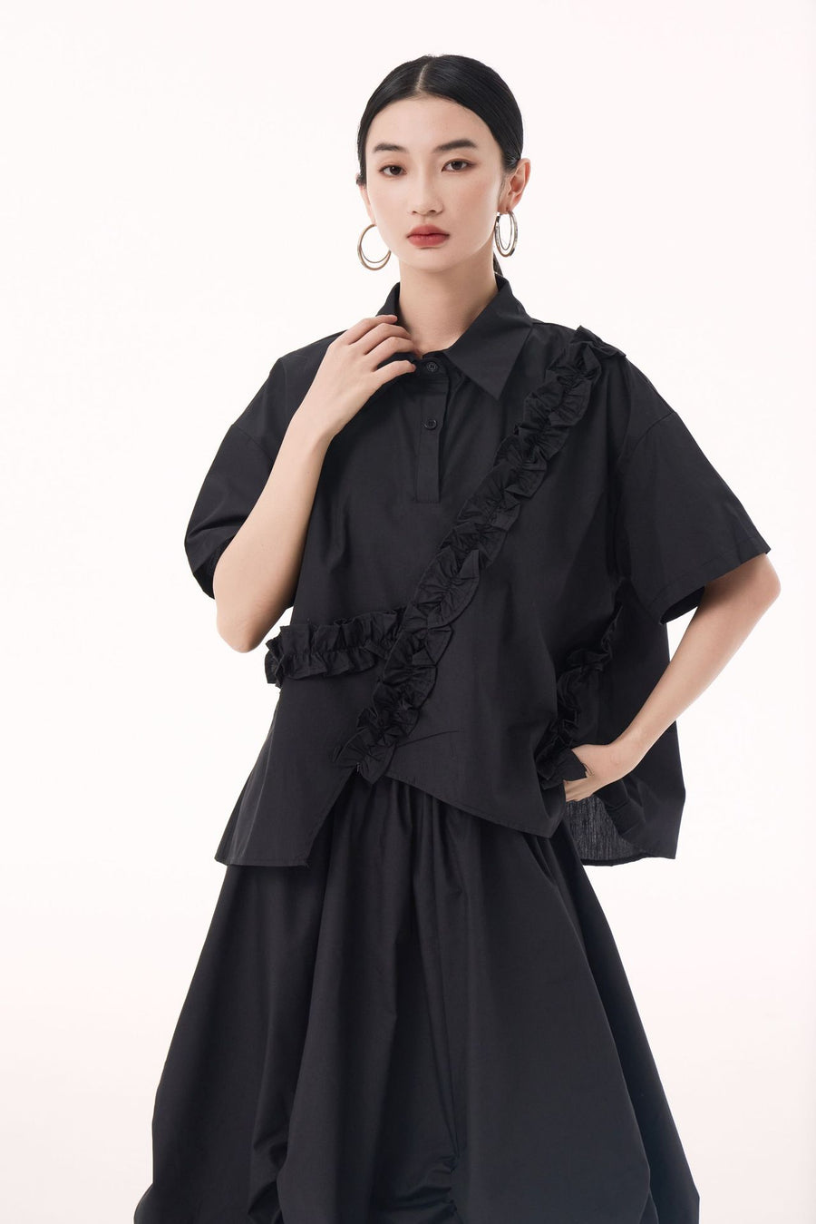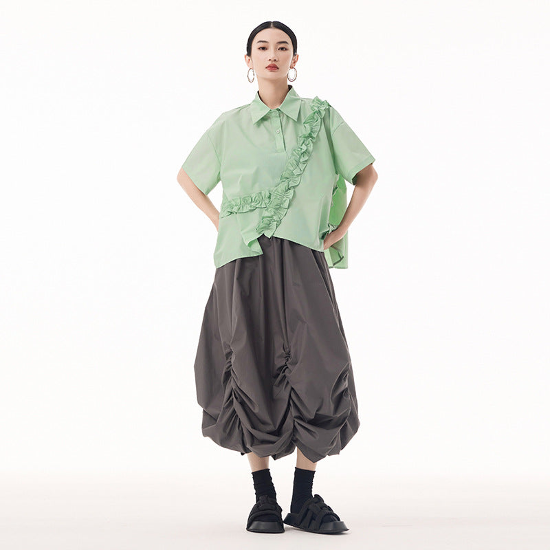 Asymmetry frill short sleeve shirt